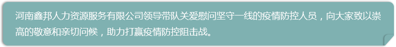 社區(qū)是疫情防控的第一線,排查、登記、解惑答疑……正是這些既零碎又繁重的工作,正是他們認真耐心的職守,為市民們構(gòu)筑了一道嚴(yán)密的防控網(wǎng),作為本土企業(yè),在疫情防控的嚴(yán)峻時期,河南鑫邦人力資源服務(wù)有限公司會更好地承擔(dān)社會責(zé)任,發(fā)揮示范引領(lǐng)作用,為奪取疫情防控阻擊戰(zhàn)最的勝利做出貢獻!