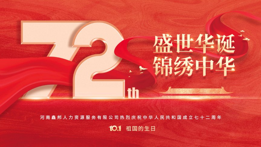 金秋十月度國(guó)慶,神州大地花似錦。2021年是中華人民共和國(guó)成立72周年。在這舉國(guó)同慶的日子,河南鑫邦人力資源服務(wù)有限公司恭祝我們偉大的祖國(guó)繁榮昌盛,早日實(shí)現(xiàn)中華民族偉大復(fù)興的中國(guó)夢(mèng)!